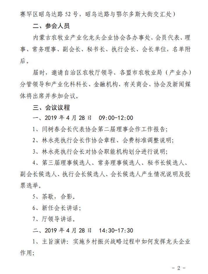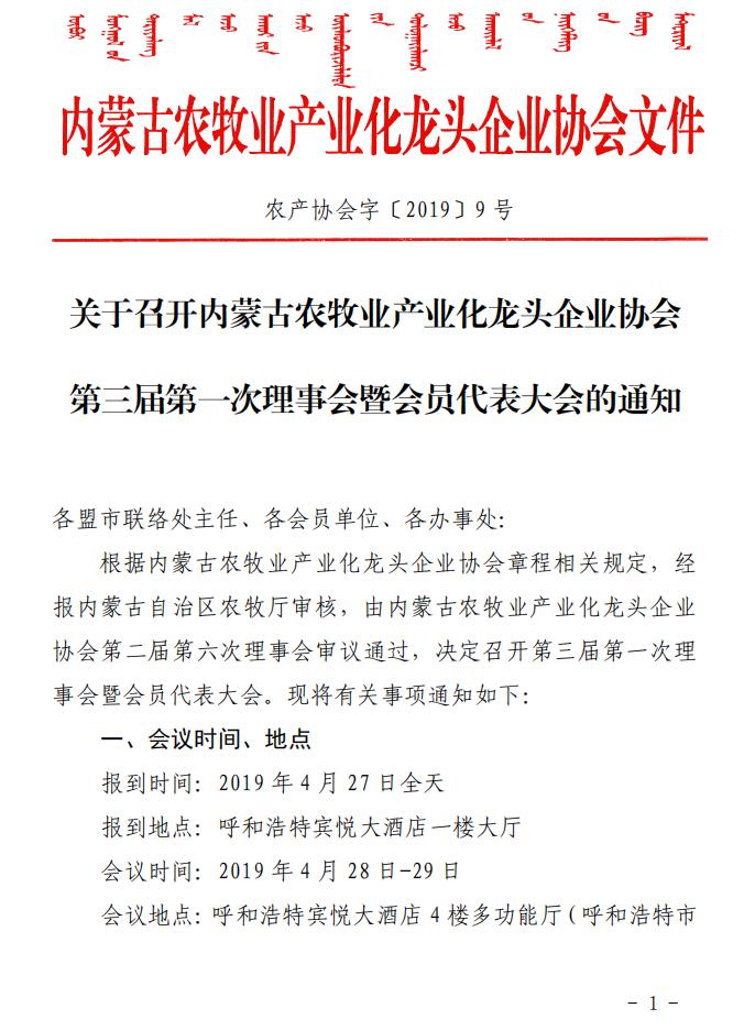 關(guān)于召開(kāi)內(nèi)蒙古農(nóng)牧業(yè)產(chǎn)業(yè)化龍頭企業(yè)協(xié)會(huì)第三屆第一次理事會(huì)暨會(huì)員代表大會(huì)的通知