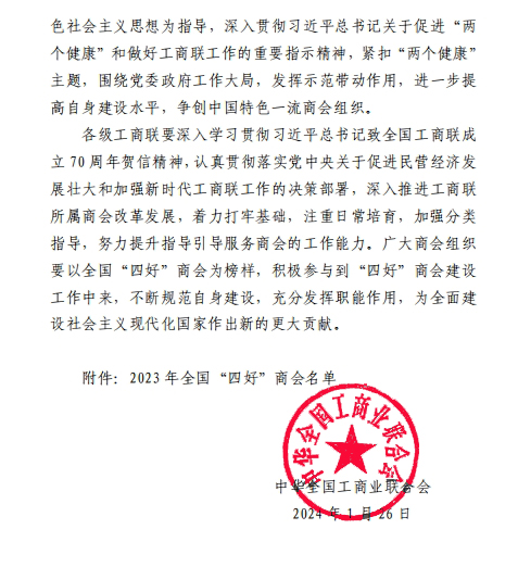 近日,中華全國(guó)工商業(yè)聯(lián)合會(huì)發(fā)布《關(guān)于認(rèn)定2023全國(guó)“四好”商會(huì)的通報(bào)》,通報(bào)指出,按照全國(guó)“四好”商會(huì)建設(shè)標(biāo)準(zhǔn),通過(guò)自下而上逐級(jí)推薦、省級(jí)工商聯(lián)審核把關(guān)和全國(guó)工商聯(lián)組織審定,認(rèn)定全聯(lián)1798家商會(huì)為2023年全國(guó)“四好”商會(huì)。其中內(nèi)蒙古自治區(qū)45家商(協(xié))會(huì)獲此殊榮,內(nèi)蒙古農(nóng)牧業(yè)產(chǎn)業(yè)化龍頭企業(yè)協(xié)會(huì)榜上有名!在此,謹(jǐn)向關(guān)心、支持協(xié)會(huì)的各位同仁表示衷心的感謝!同時(shí),對(duì)獲此殊榮的各兄弟商協(xié)會(huì)表示熱烈祝賀!