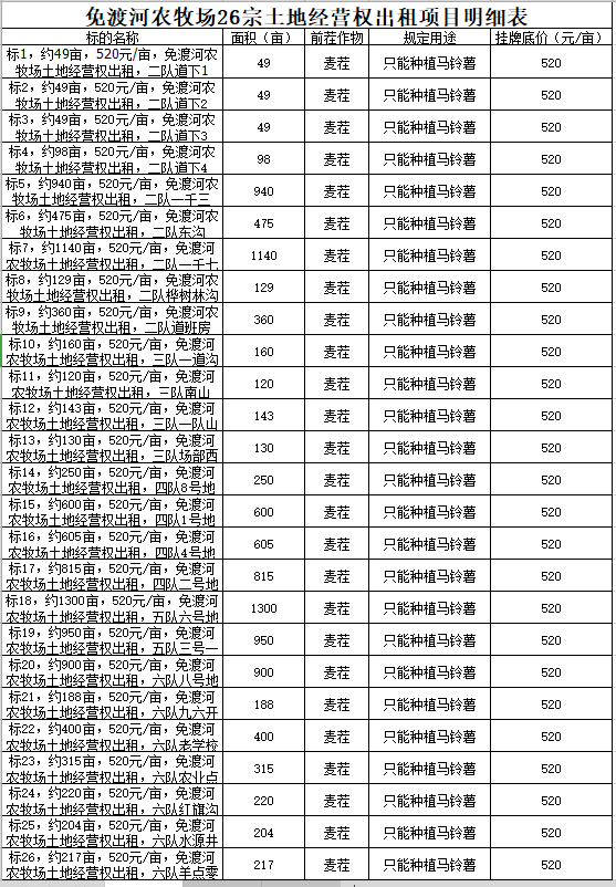 7.掛牌價(jià):見明細(xì)表(掛牌價(jià)為每畝耕地應(yīng)當(dāng)支付的租賃底價(jià))