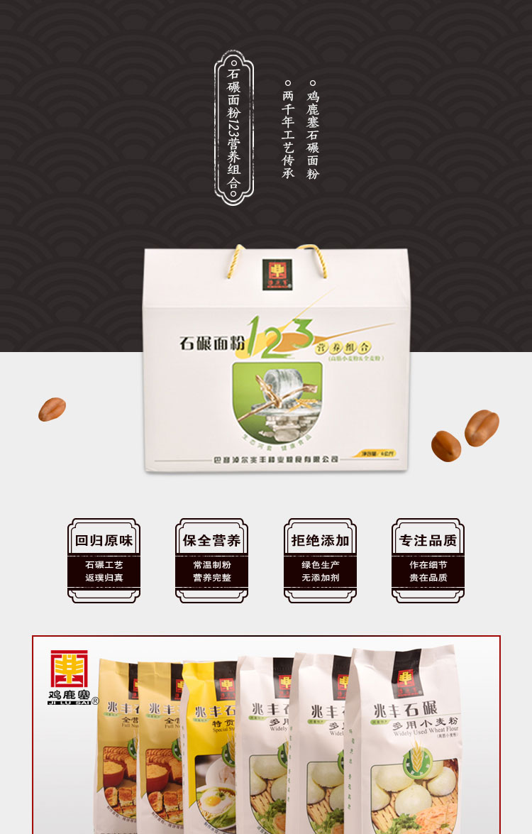 產(chǎn)品名稱:雞鹿塞 石碾面粉123營養(yǎng)組合 禮盒 6kg 河套高筋面粉 禮盒