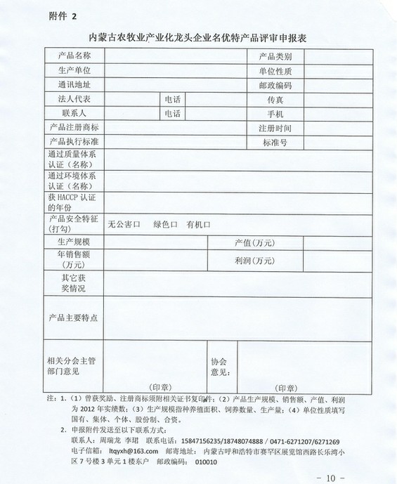 附件2:內蒙古農牧業(yè)產業(yè)化龍頭企業(yè)名優(yōu)特產品評審申報表.doc