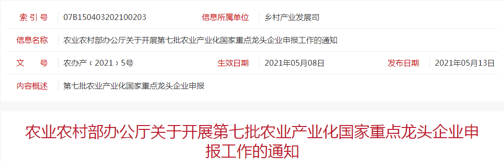 標(biāo)題:農(nóng)業(yè)農(nóng)村部辦公廳關(guān)于開展第七批農(nóng)業(yè)產(chǎn)業(yè)化國(guó)家重點(diǎn)龍頭企業(yè)申報(bào)工作的通知