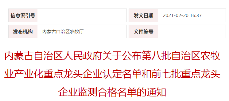 企業(yè)名稱(chēng):內(nèi)蒙古自治區(qū)人民政府關(guān)于公布第八批自治區(qū)農(nóng)牧業(yè)產(chǎn)業(yè)化重點(diǎn)龍頭企業(yè)認(rèn)定名單和前七批重點(diǎn)龍頭企業(yè)監(jiān)測(cè)合格名單的通知