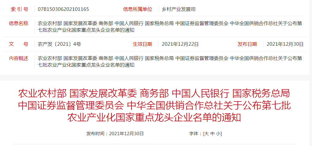 企業(yè)名稱:農(nóng)業(yè)農(nóng)村部 國(guó)家發(fā)展改革委 商務(wù)部 中國(guó)人民銀行 國(guó)家稅務(wù)總局 中國(guó)證券監(jiān)督管理委員會(huì) 中華全國(guó)供銷合作總社關(guān)于公布第七批農(nóng)業(yè)產(chǎn)業(yè)化國(guó)家重點(diǎn)龍頭企業(yè)名單的通知