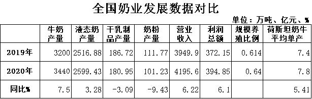 新冠肺炎疫情后,乳業(yè)成為逆勢(shì)增長(zhǎng)的行業(yè)之一,乳企業(yè)績(jī)不斷好轉(zhuǎn),整個(gè)行業(yè)的利潤(rùn)總額同比降幅不斷收窄,10月利潤(rùn)總額增幅由負(fù)轉(zhuǎn)正,今年以來首次轉(zhuǎn)為正值。隨著消費(fèi)者對(duì)健康飲食更加重視,乳業(yè)的未來發(fā)展會(huì)更好。根據(jù)國(guó)家統(tǒng)計(jì)局?jǐn)?shù)據(jù),2020年全國(guó)液態(tài)奶產(chǎn)量2599.43萬噸,同比增長(zhǎng)3.28%;全國(guó)干乳制品產(chǎn)量180.95萬噸,同比下降3.09%;全國(guó)奶粉產(chǎn)量101.23萬噸,同比下降9.43%,其中12月份產(chǎn)量10.15萬噸,同比下降1.41%。規(guī)模以上乳企主營(yíng)業(yè)務(wù)收入4195.58億元,同比增長(zhǎng)6.22%;利潤(rùn)總額394.85億元,同比增長(zhǎng)6.10%,利潤(rùn)總額增幅轉(zhuǎn)正,銷售利潤(rùn)率9.41%。奶業(yè)轉(zhuǎn)型升級(jí)加快推進(jìn)。全國(guó)奶牛規(guī)模養(yǎng)殖比例達(dá)到64%,同比提高2.6個(gè)百分點(diǎn)。全國(guó)荷斯坦奶牛平均單產(chǎn)超過7.8噸,同比增長(zhǎng)400千克。