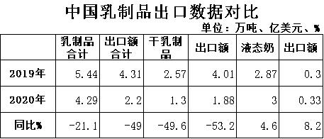 液態(tài)奶:2020年我國(guó)共出口液態(tài)奶3.0萬噸,同比增加4.6%,出口額0.33億美元,同比增長(zhǎng)8.2%。