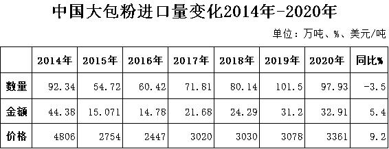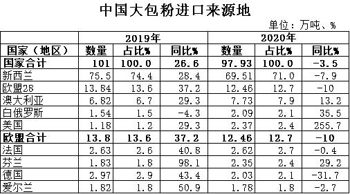 據(jù)中國(guó)海關(guān)統(tǒng)計(jì),2020年進(jìn)口大包粉97.93萬噸,同比-3.5%,進(jìn)口額32.91億美元,同比+5.4%,均價(jià)3361美元/噸,同比+9.2%,主要來自新西蘭占71%、歐盟占12.7%、澳大利亞占7.9%。