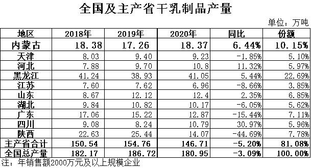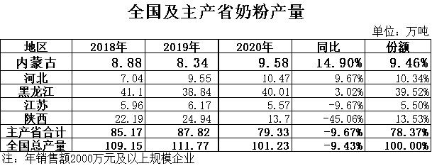 奶粉:根據(jù)國(guó)家統(tǒng)計(jì)局?jǐn)?shù)據(jù),2020年全國(guó)奶粉產(chǎn)量101.23萬噸,同比下降9.43%,其中黑龍江產(chǎn)量40.01萬噸,同比增長(zhǎng)3.02%,占總產(chǎn)量的39.52%,位居全國(guó)第一位;內(nèi)蒙古產(chǎn)量9.58萬噸,同比增長(zhǎng)14.90%,占總產(chǎn)量的9.46%,位居全國(guó)第四位。
