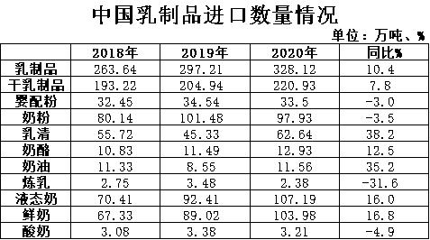 2020年我國(guó)共計(jì)進(jìn)口各類乳制品328.12萬噸,同比+10.4%,進(jìn)口額117.06億美元,同比+5.2%,折合生鮮乳1875萬噸,同比+8.3%(干制品按1:8,液態(tài)奶按1:1折算)。